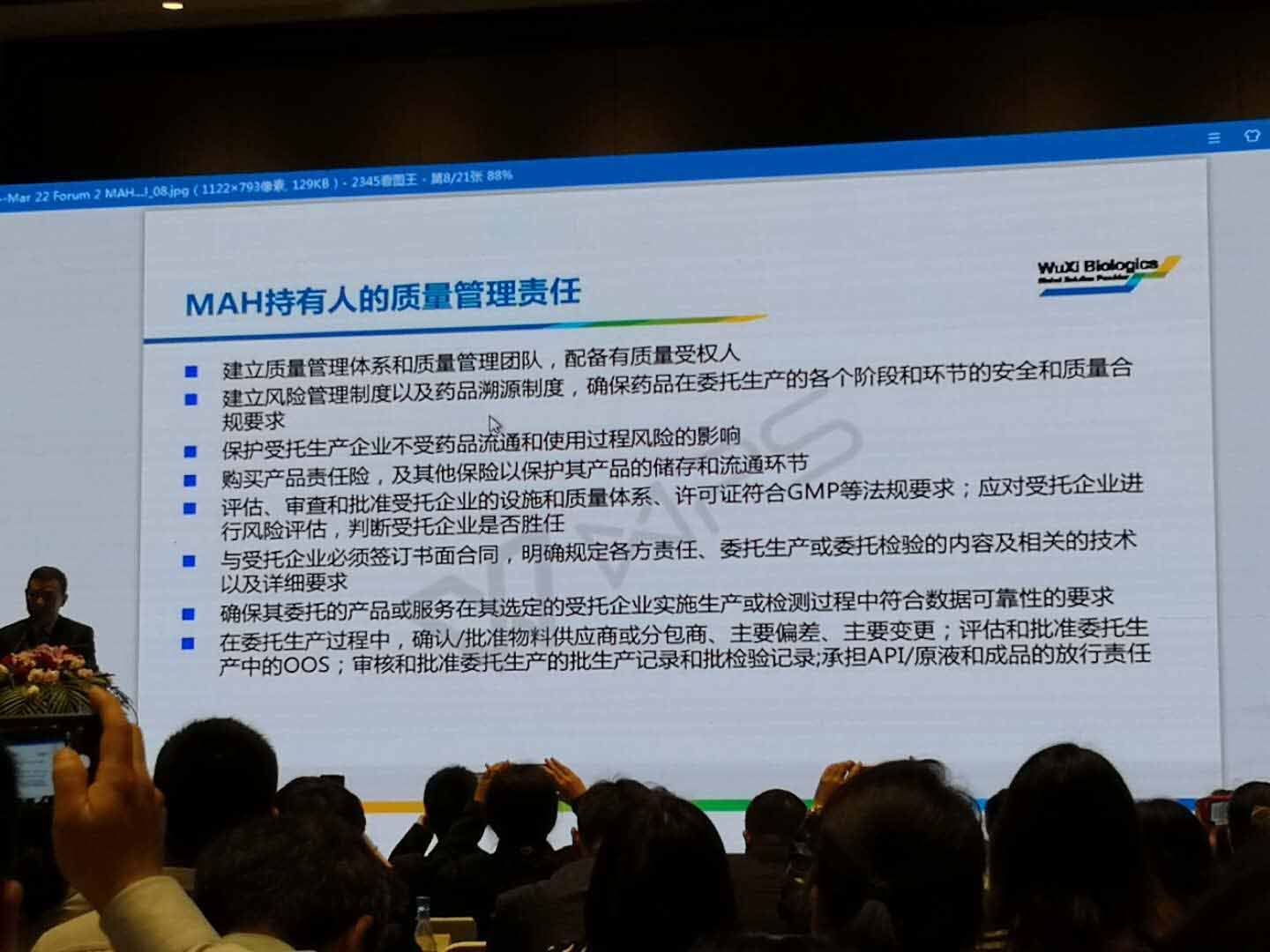 22日下午1時(shí),藥品MAH試點(diǎn)主題論壇如期舉行,與會(huì)者濟(jì)濟(jì)一堂,首先聽取了江蘇省藥品監(jiān)督管理局藥品注冊(cè)處處長(zhǎng)關(guān)于MAH制度管理解讀,對(duì)持有人法律責(zé)任、MAH委托生產(chǎn)管理、委托銷售管理、臨床ADR監(jiān)測(cè)、MAH保險(xiǎn)救濟(jì)等方面內(nèi)容有了深入的了解。接著,藥明生物等知名藥企代表更從實(shí)踐的角度詳細(xì)介紹MAH的落地,可以說受益匪淺。